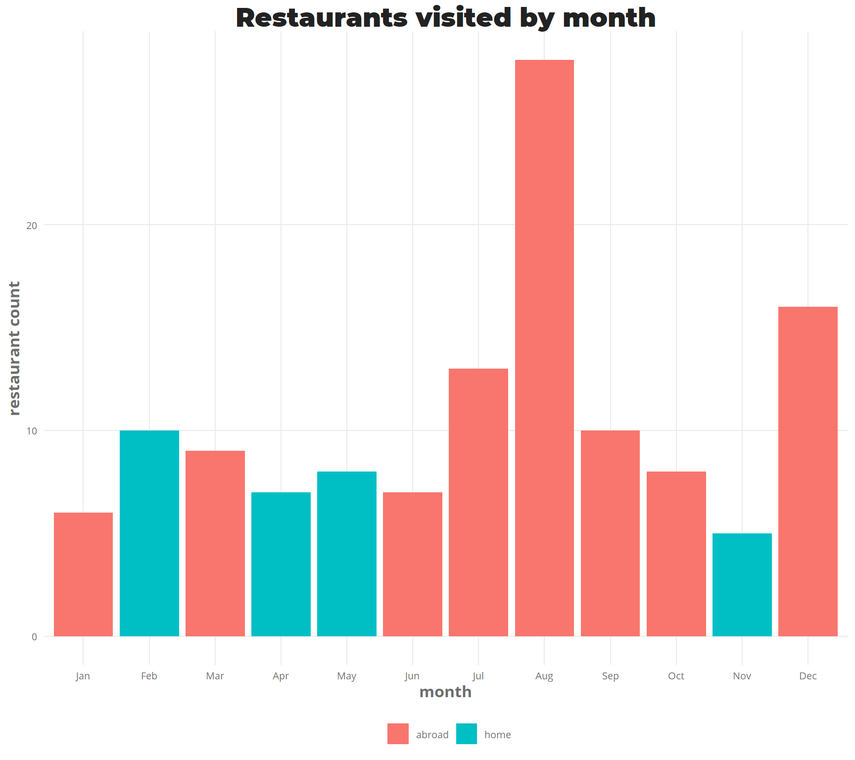 mutate(abroad = ifelse(month %in% month_abroad,"abroad","home"))We can then easily plot it, August and December, the period with the longest vacations are the ones that have had the biggest visits to restaurants.