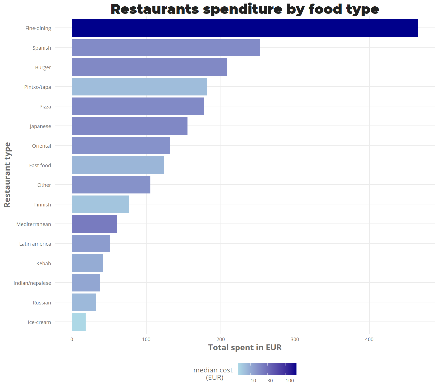 Work cantine is considered as Finnish restaurant type, thus the low median cost, as the lunch there costs only between 4-6 euros. Something interesting is that even if the Pintxo/tapa category has a very low median cost, it ranks to 4th in the categories where I have spent most money, indicating that I have been in a lot of such restaurants/bars.