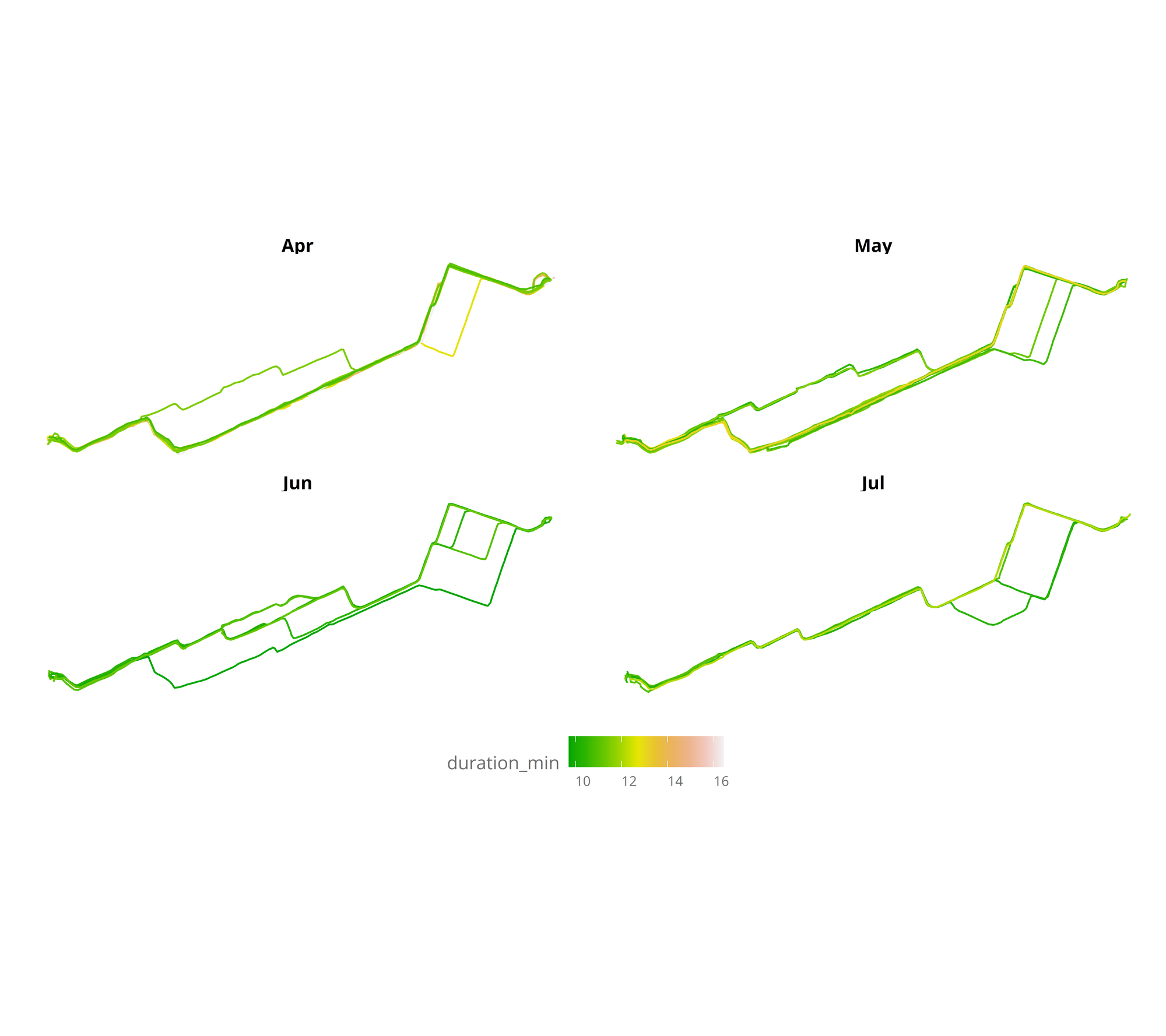 In the visualization, it can be seen that winter months are the slowest, and also that during April I started to go through a bit different route, to finally ending taking the same route everyday. Measuring the time almost everyday has made it clear that it is the fastest route (mainly as there aren’t so many traffic lights). But let’s plot the same, focusing only from April to August (all months without snow).
