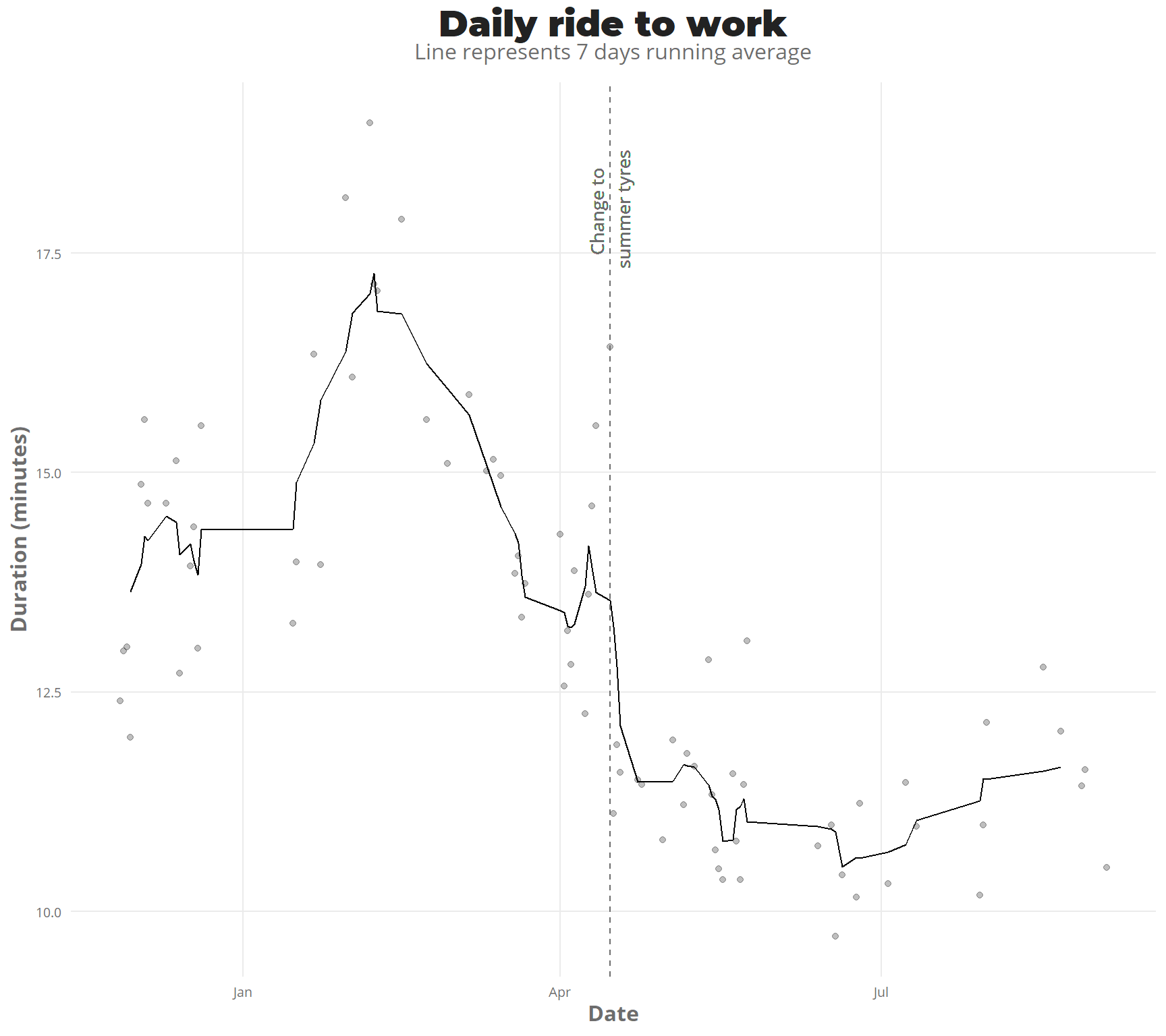 geom_text(aes(x = dmy("15/4/2019"),y = 18,label = "Change to \nsummer tyres",angle = 90),